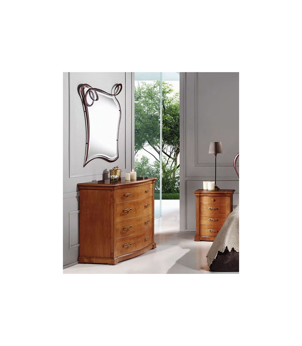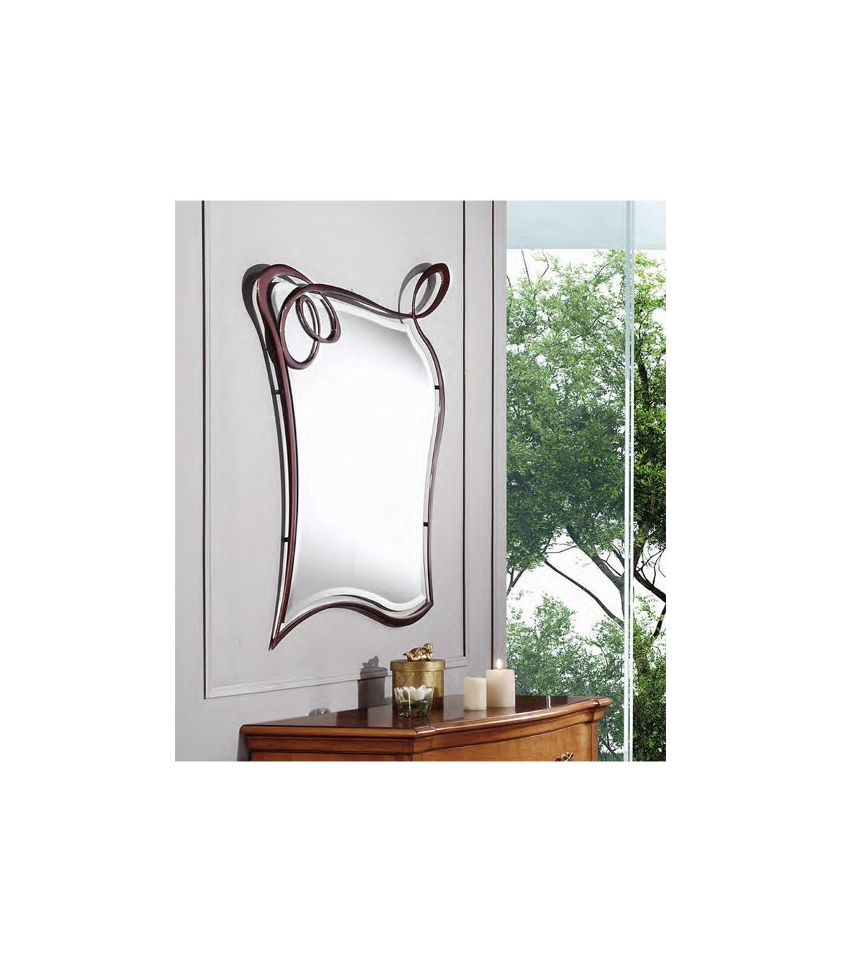 O espelho DIVA destaca-se por seus cachos que cruzam uns aos outros e pela irregularidade de sua lua de espelho. Um complemento perfeito para móveis de madeira confortáveis e auxiliares. Também disponível em pátina branca lacado, mink ou pão de prata.